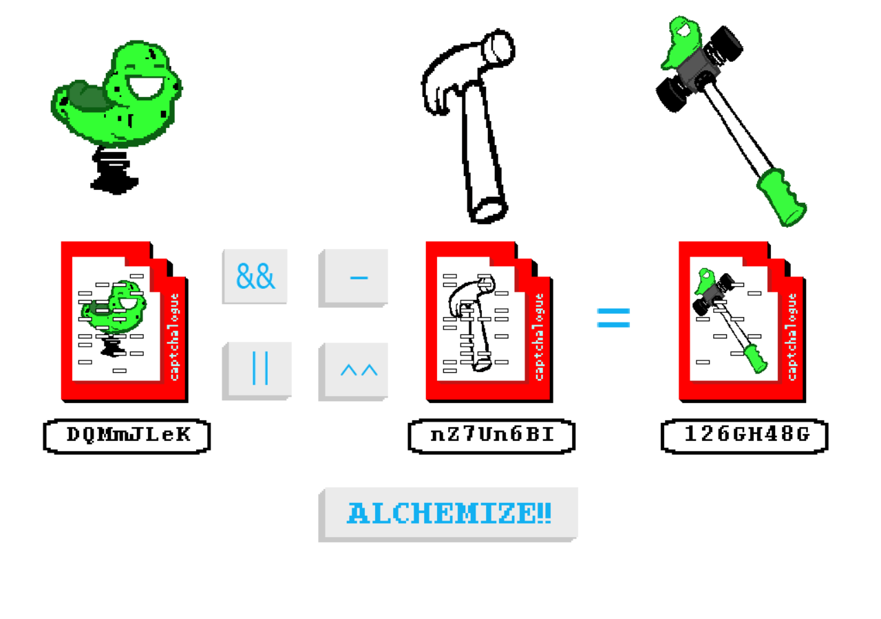 A recreation of an "alchemy crafting" system that uses bitwise math on the item's unique code. This code is represented as a punched card, which can be combined with other cards through various operations. The original had ‘and’ and ‘or’, but I also added ‘xor’ and ‘abjunction’.